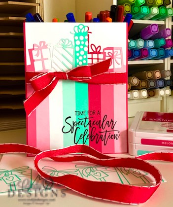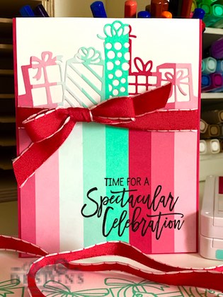 The Birthday Cheer Bundle is part of my April 2019 Card Kit, which I will introduce to you in a separate blog post. Today’s project is a great tween card that’s bright and fun. I die-cut in presents from the Detailed Birthday Edgelits Dies onto How Sweet It Is Designer Series paper. The stripped pattern is Coastal Cabana and Melon Mambo in various hues. This was adhered onto Whisper White CS.