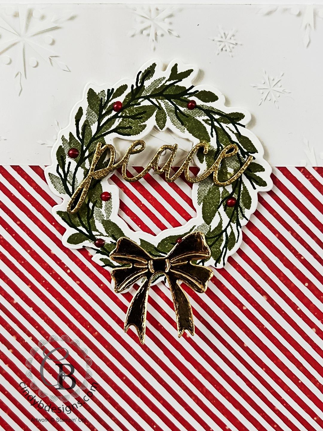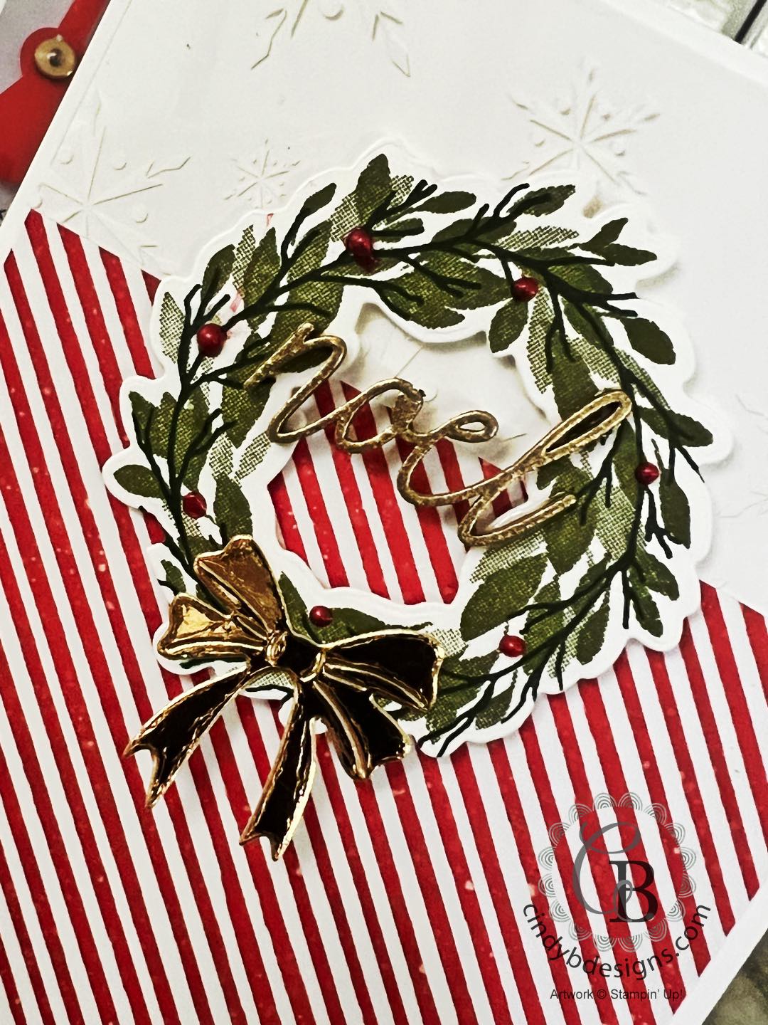 The Real Red berries around the wreaths are our Pearlized Enamel Effects Basics that is part of the Gingham Cottage Suite Collection. You have to let these dry and preferably overnight. I really should have got into my rhythm on grid paper to practice applying the enamel first. If you get bubbles, use a sharp object to pop it and sometimes lightly tapping the card onto your work surface helps even your drops out.