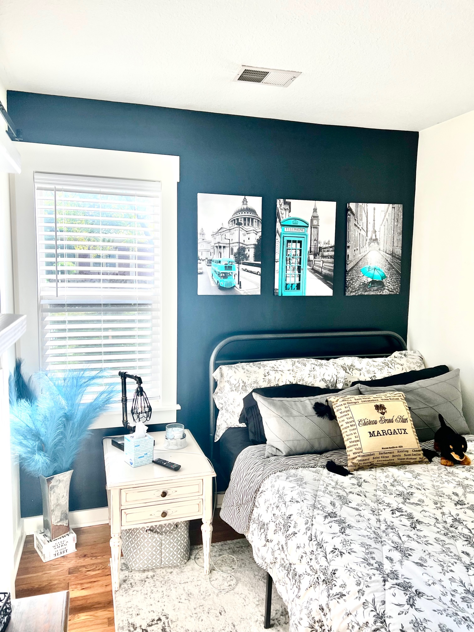 On the flip side, sometimes the accent color gets the eye first and then you take in the rest. My black, white, and gray room gets a lot of sunlight and I knew I could go with a small black wall, which is something I’ve been wanting to do, so I went for it and love how it turned out. My bright teal accent color was inspired by an eye cream jar lid. I tossed this on my bed a few weeks after I painted the black wall and the moment I was waiting for to complete the room.