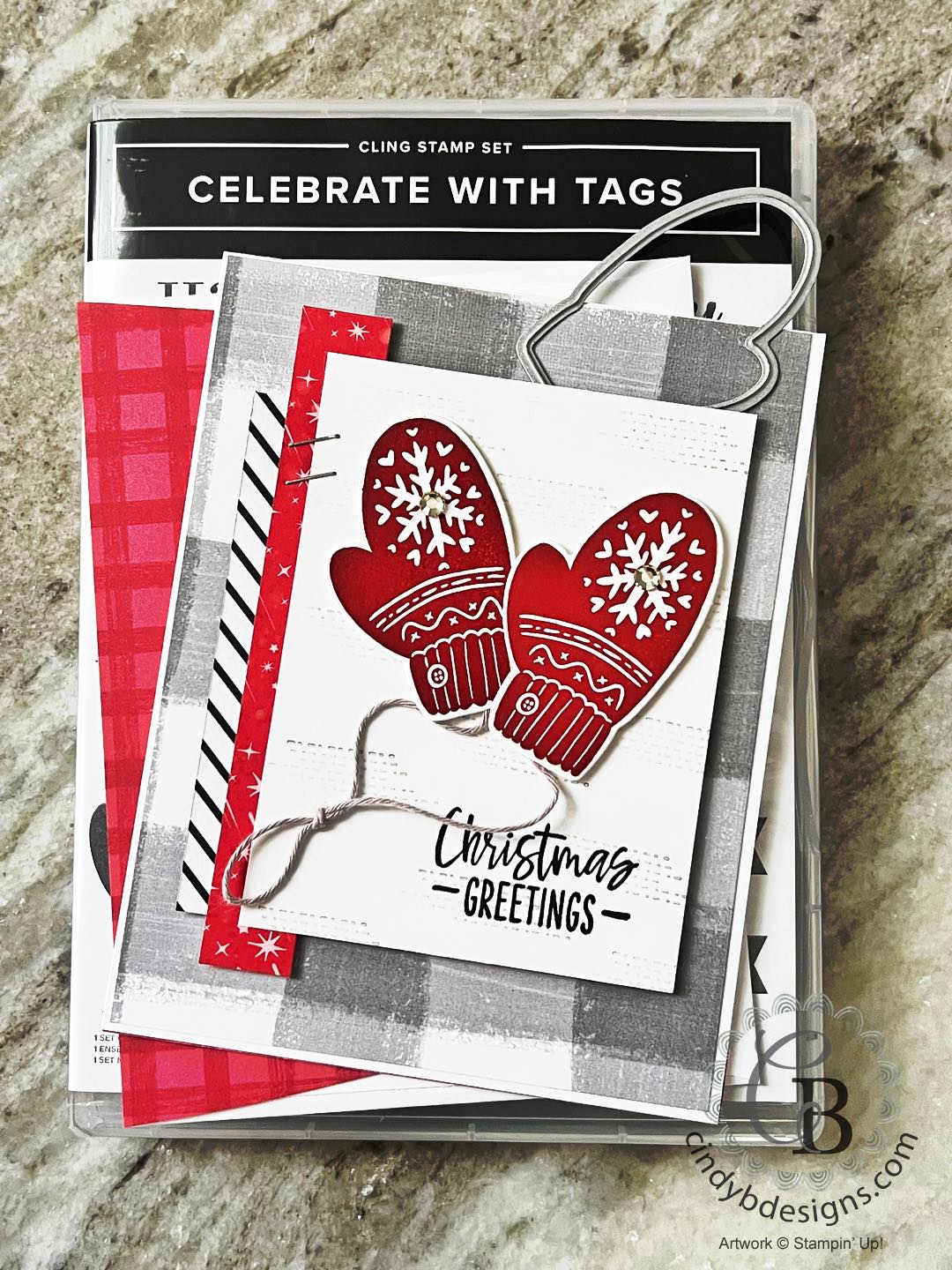 I stamped the large mitten x2 image from Celebrate With Tags onto Basic White Regular CS in Real Red, low heat set it real quick, because red is a fussy smear color, and then cut from its coordinating Celebration Tag Dies.