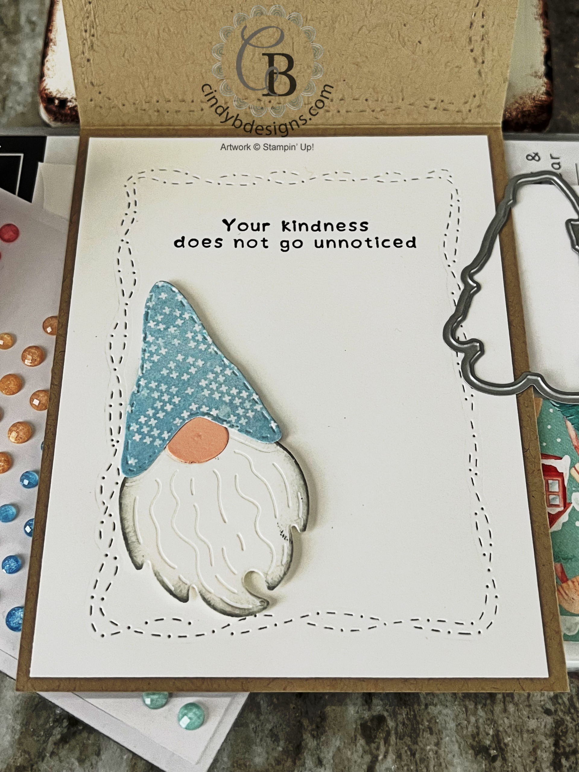 The gnomes were adhered with Stampin’ Dimensionals as shown above for some fantastic textural dimension.