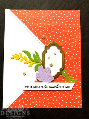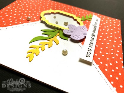 I’ve been doing a lot of die-cutting, collage-type of cards lately because not everything really has to go together, which is difficult to articulate. I have combined a lot of our products on this card, as well as dies that is a seaweed cut that I altered with Paper Snips from Sailing Away from Daffodil Delight and Granny Apple Green. The Fireside Dies make up my gold frame and the Whisper White panel behind the frame that I adhered the Pearl Basic Jewels to. A Purple Posy flower was die-cut from Cherry Blossoms. The background DSP is from Playing With Patterns. The sentiment was stamped in Memento Tuxedo Black from the Forever Blossoms stamp set.