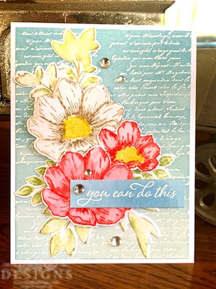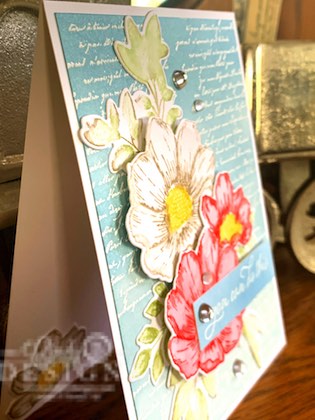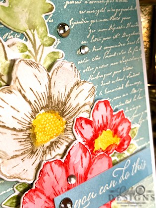 The foliage was adhered with Seal and the flowers + sentiment adhered with Stampin’ Dimensionals.