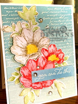 I stamped the script image from Very Versailles onto Shimmery White CS several times in Versamark and heat embossed it with white powder. I loaded up my Blending Brush with the soon-to-be retired Seaside Spray ink and started from the top blending down in an ombre fashion. Remember, it’s all in the wrist and the pressure that you apply. Our Blending Brushes are fabulous and the best I have ever worked with. They are also very wrist and arthritis friendly.