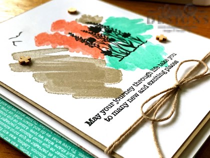 I adhered the image panel to the Crumb Cake mat with Seal. I wrapped our new Crumb Cake Baker’s Twine twice around the panel towards the bottom and tied a bow at the center. I added Stampin’ Dimensionals to the back of the image panel and adhered to the card base. Three In Good Taste Wooden Elements were scattered about the card adhered with a Fine-Tip Glue Pen.