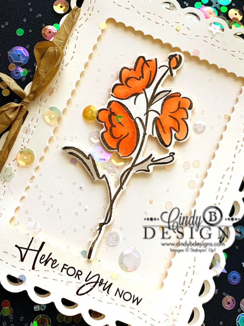 I put the colored image back into my Stamparatus and re-stamped with Early Espresso Ink, then cut from the coordinating die. I added Mini Stampin’ Dimensionals to the back of the image.
