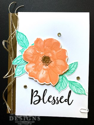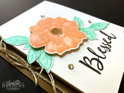 This card is A2, top-folding Soft Suede card base with the back of the card being 4-1/4 x 5-1/2. I used my Stampin’ Trimmer to trim off 1/2″ on the left side of the card for a little something different.