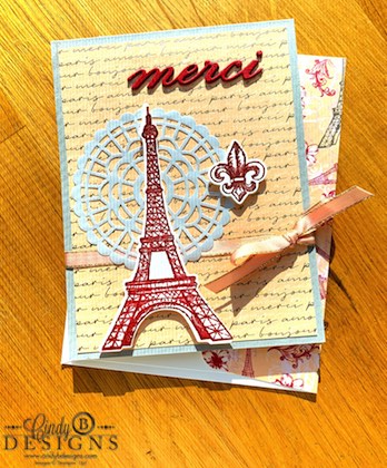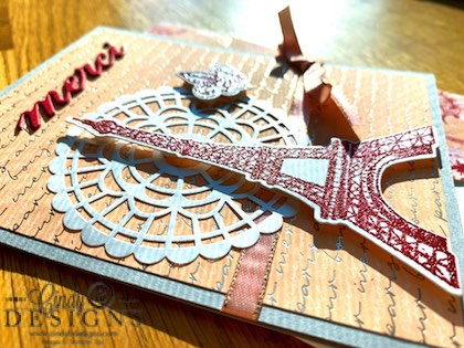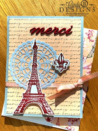 Stamps, paper, ink, and die-cuts. The only outside embellishment I brought in is the Pearlized Doily and stepped outside of the suite colors with the Smoky Slate CS. ‘merci’ was die-cut and stacked 3x. The Tiddle was a bit challenging, but necessary.