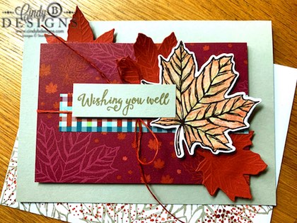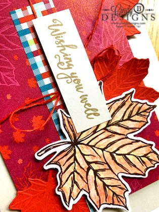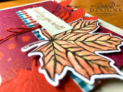 The large leaf was stamped in Early Espresso ink and colored in with watercolor pencils in Pumpkin Pie, Cajun Craze, Old Olive, with Early Espresso, then blended out, and die-cut.