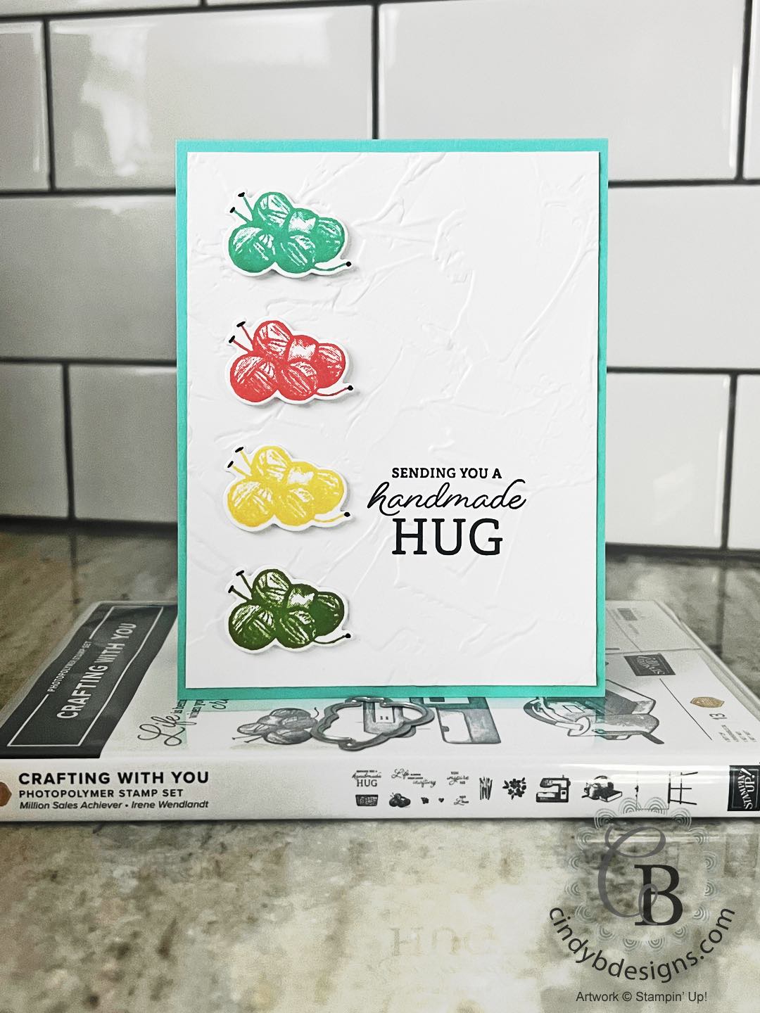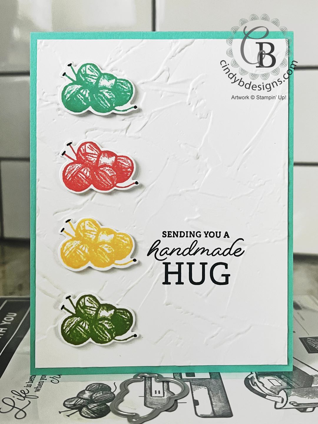 For final assembly, two Mini Stampin’ Dimensionals were adhered to the back to the yarn images and then to the card.