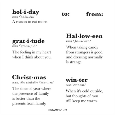 My favorite new sentiment set from the Holiday Catalog is Well Defined, which is shown below, that I masked off and stamped in Memento Tuxedo Black.