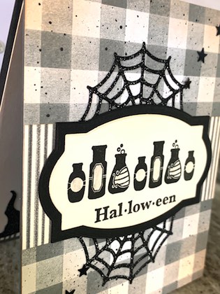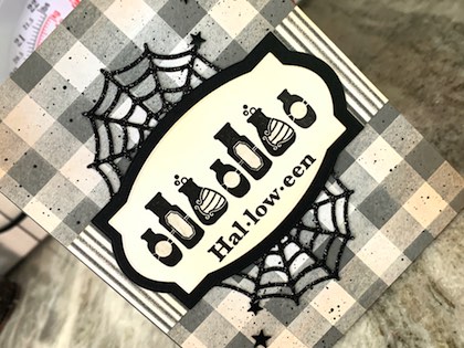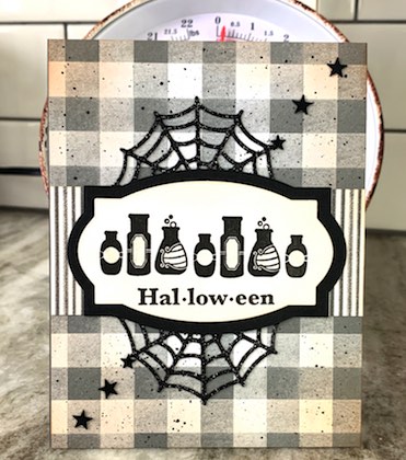 I then focused my attention on die-cutting the spider web from Frightful Tags Dies from a favorite carryover of Black Glimmer Paper. I cut this in half and adhered to the card base, one on each side of the striped DSP, with liquid adhesive. The image panel was adhered with Seal. Six Basic Black Cute Stars Adhesive-Backed Sequins were adhered to the card to accent.