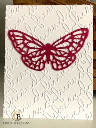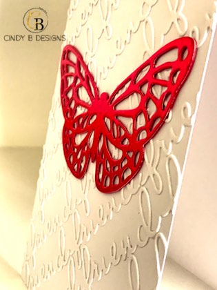 The large butterfly Framelit from Abstract Impressions and ‘Friend’ script word from Well Written is all that’s on front. I started out with a Thick Whisper White A2 top-folding card base and also cut the ‘Friend” die from the same as I adhered a Multipurpose Adhesive Sheet to the back, knew there was some weeding out of the loops in the words, and didn’t want crumpled up card stock. I started to lay down the script at the top left of the card and let the F and D of the word determine my spacing, which kept me even without a ruler. The butterfly Framelit was cut twice with a piece of Lovely Lipstick and the same color Foil Sheet with a Multipurpose Adhesive Sheet. I simply lined them up and adhered, which wasn’t hard at all, considering you have zero wiggle room with the adhesive sheets.