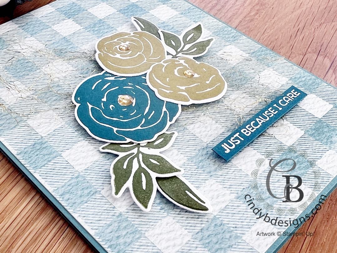 For final assembly, I cut a length of that fantastic Gold Open Weave Trim that I gently stretched every which way to ground my flowers and greenery, that was adhered to the card front with a little bit of Seal.