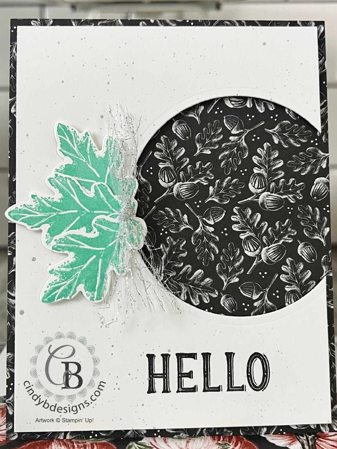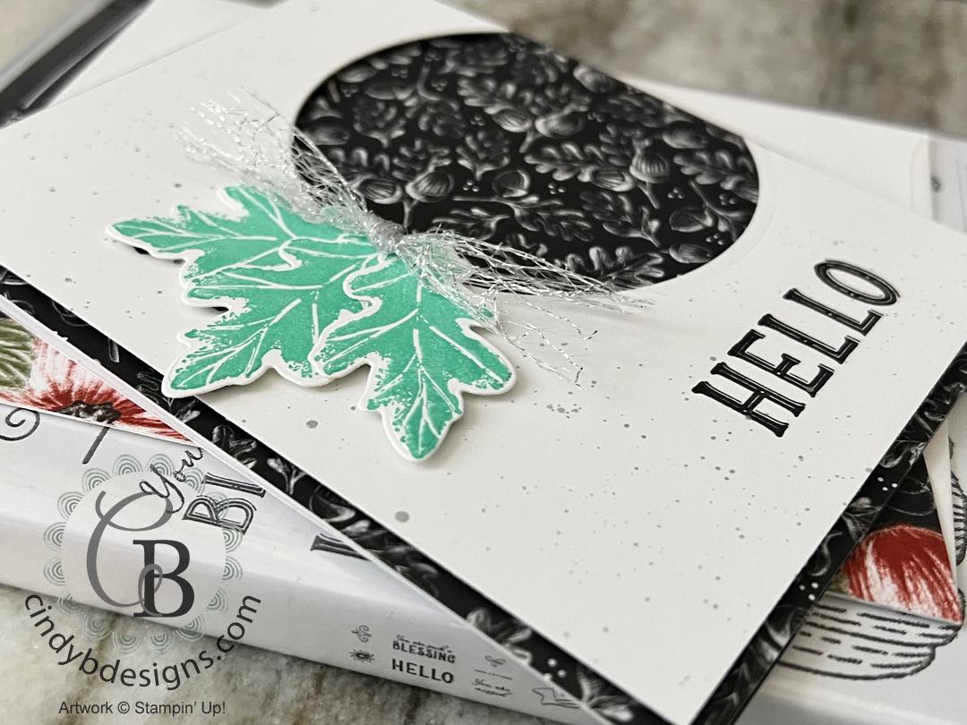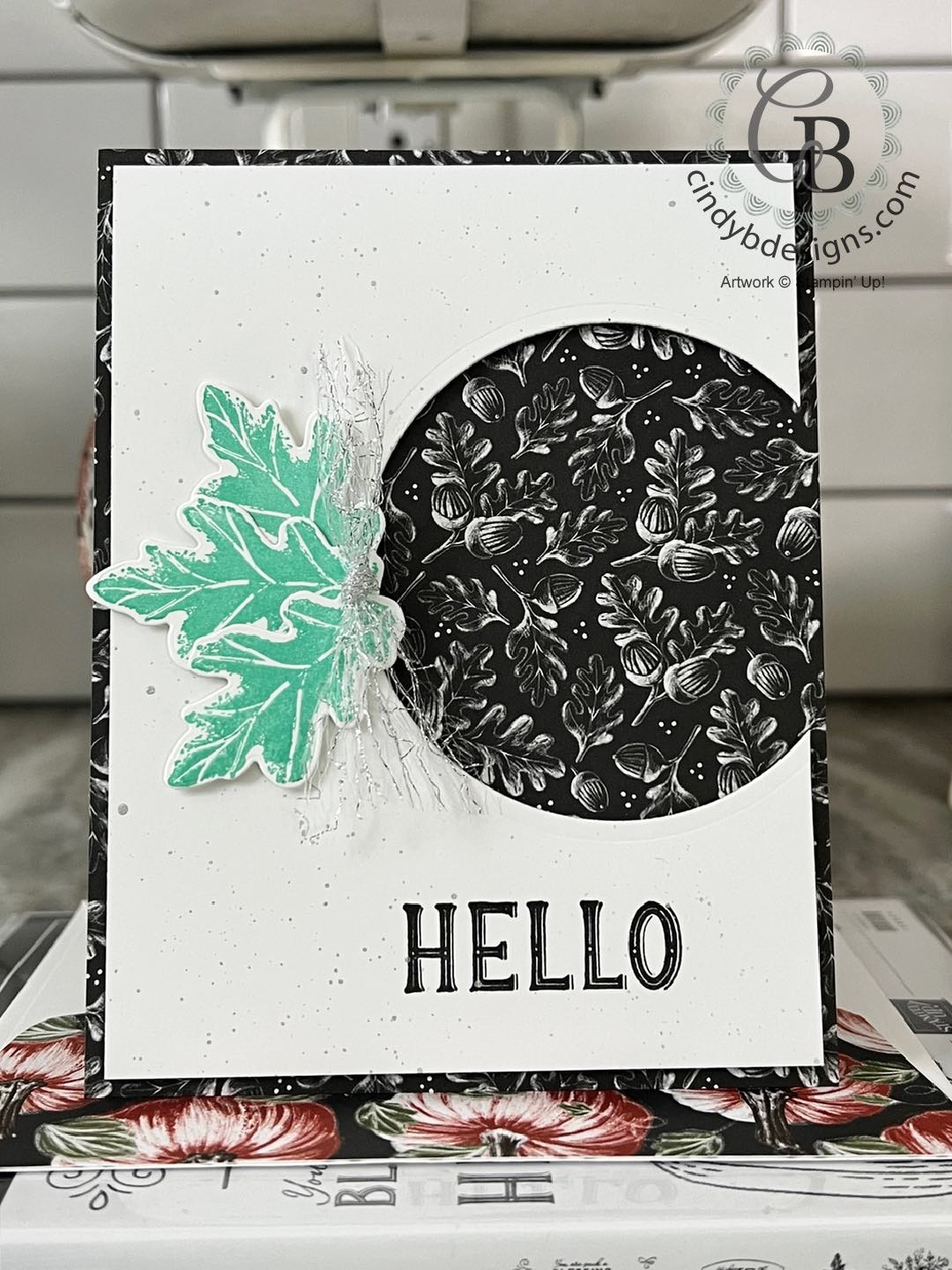 The leaves were adhered with Black Stampin’ Dimensionals at the left circle.