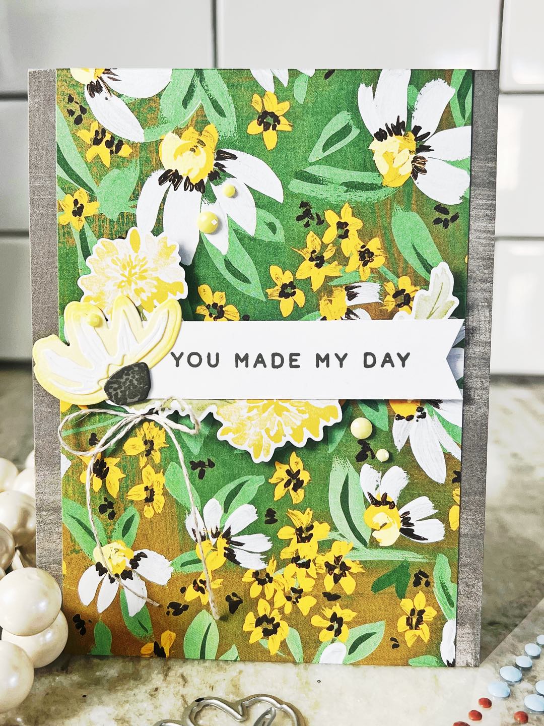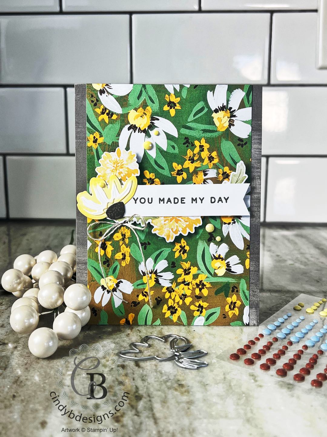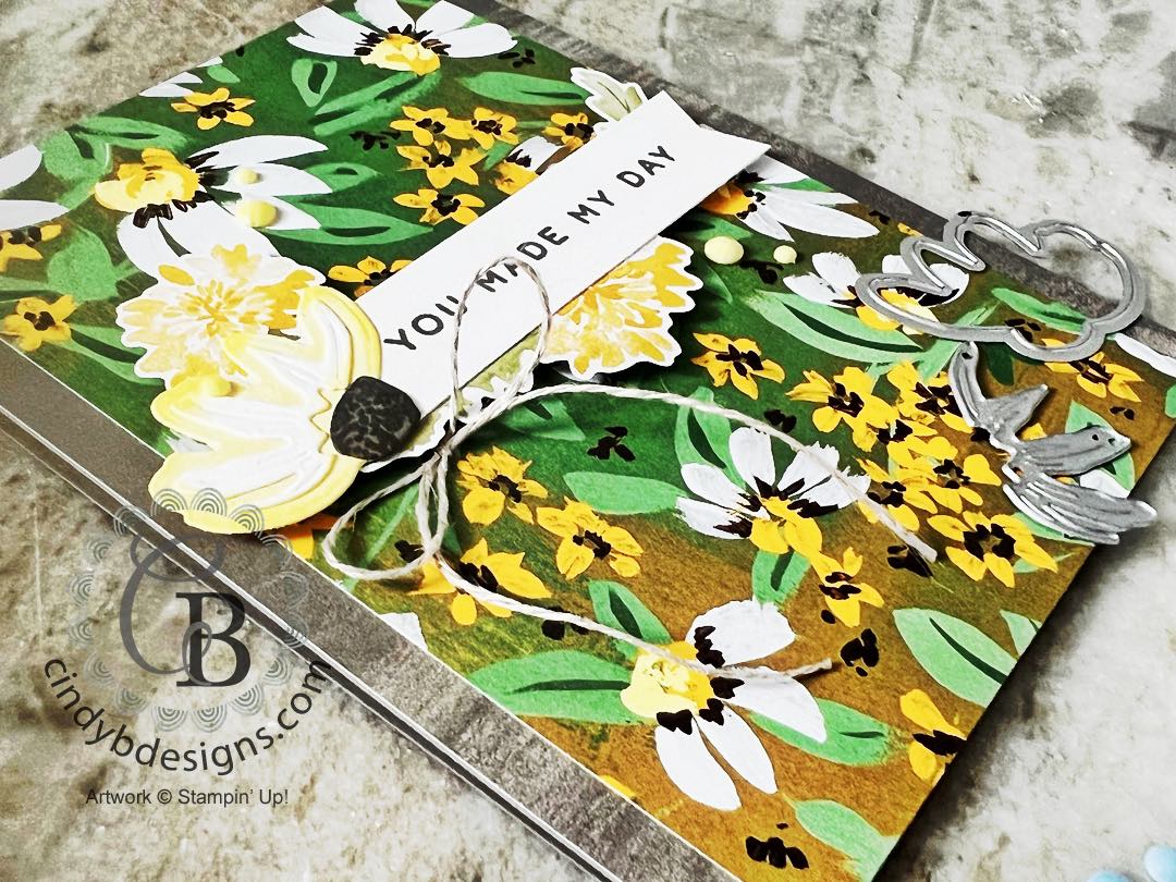 I used a flower die-cut from December 2023 Paper Pumpkin Kit behind the sentiment to break up the busy Fresh As a Daisy Designer Series Paper and Linen Thread. Other than that, this project stayed in the suite collection.