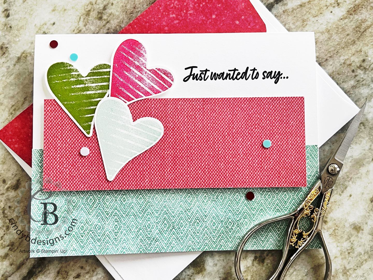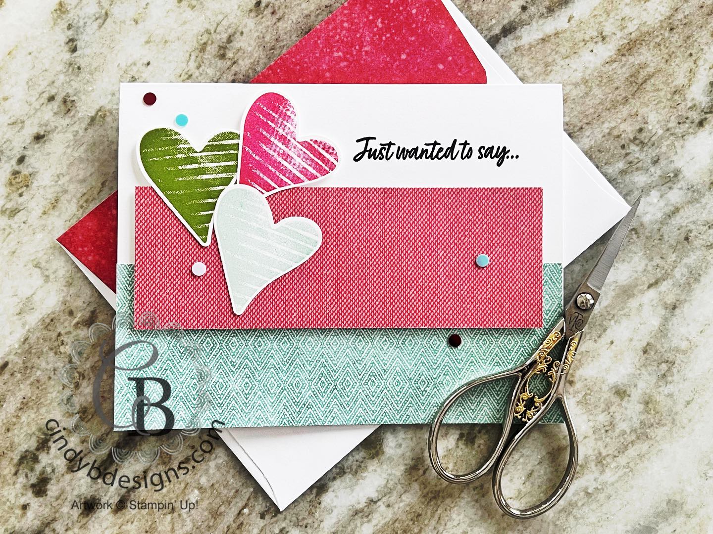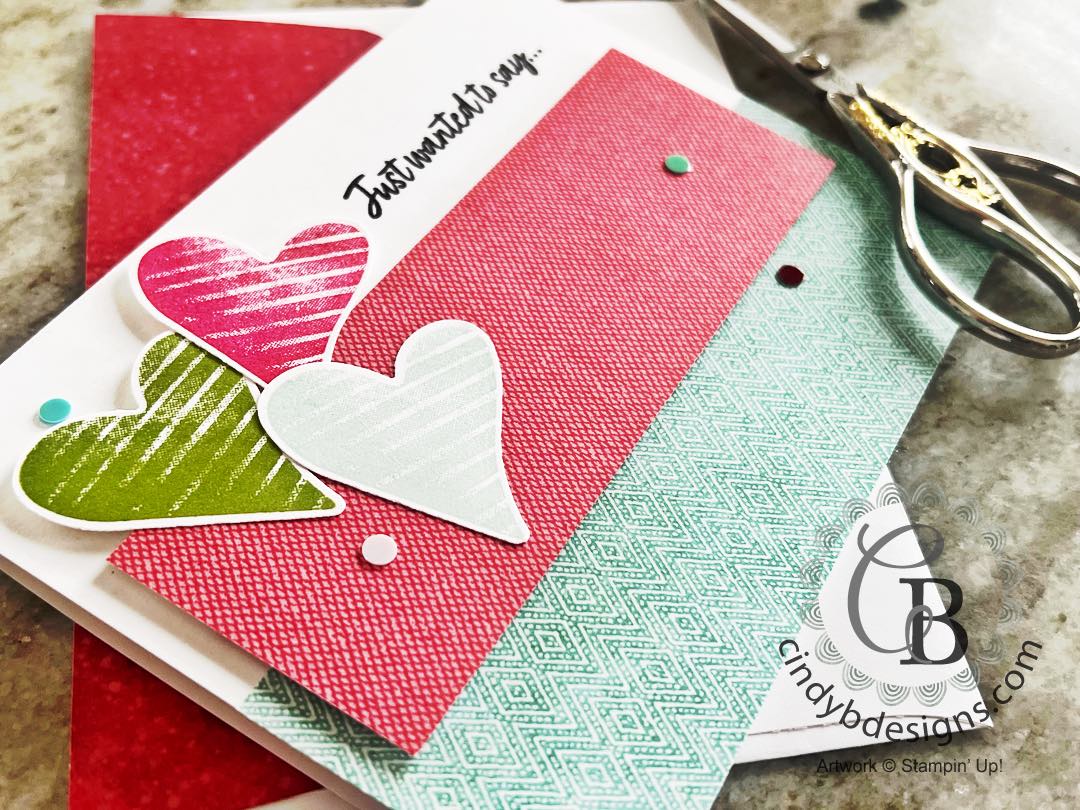 I stamped 3 hearts in Melon Mambo, Granny Apple Green, and Balmy Blue onto Basic White Regular CS from the Country Bouquet stamp set, then punched from the coordinating Country Bouquet Punch. The hearts were adhered to the card base with liquid adhesive and Stampin’ Dimensionals.