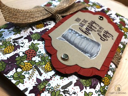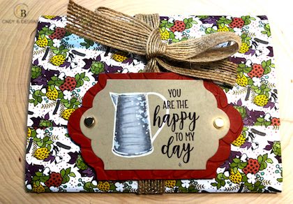 The bow unties and the image panel opens up the pocket. I also used Crumb Cake Medium Envelopes inside the pocket to tie panels together. Country Lane Designer Series Paper was used for the entire wrap.