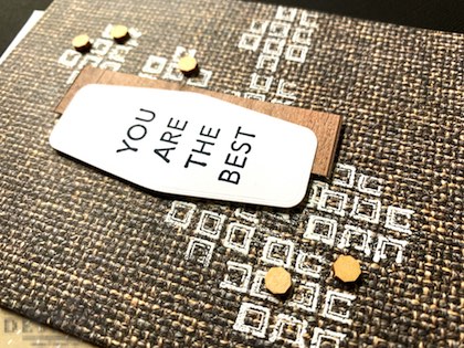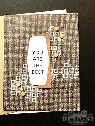 This Concept Art Card is fabulously masculine and easy to make within 5 minutes. You know how big I am on texture and dimension; and this project certainly replicates that with the white heat embossed squares, wood hexagon elements, and the woven designer series paper. The details in the Tasteful Labels dies are a must-have staple for your your paper-crafting and you will be seeing these shapes all throughout the next catalog year.
