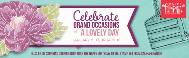 - The Lovely Day Paper Pumpkin Kit coordinates with the Happy Birthday to You Stamp set (item 152308), which is available as part of the Sale-A-Bration promotion. You can get this for FREE with a qualifying purchase of $50; before taxes and shipping, by March 31, 2020.