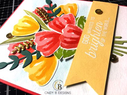 Hello y’all! Today’s card is a gem using 4 different stamp sets to get the desired effect of a flower bunch. All of the stamp sets that I used played very well together and allowed me to design this cheerful card. My images and die-cuts are from Beautiful Bouquet and Bunch of Blossoms. My sentiments are from Flourishing Phrases. Behind the flower bunch is an image stamped from Graceful Garden onto watercolor paper with Versamark, coated with white embossing powder, and then heat set for dimension and a background. I used my AquaPainter to drop in Balmy Blue to achieve the subtle background.