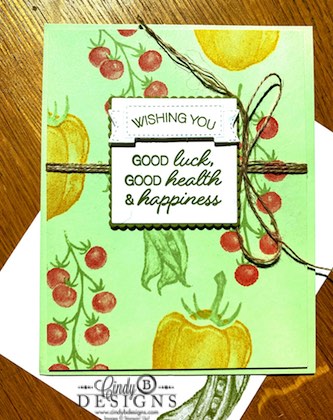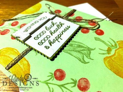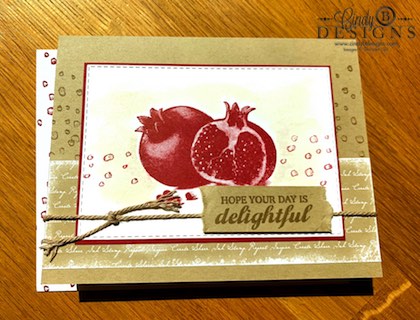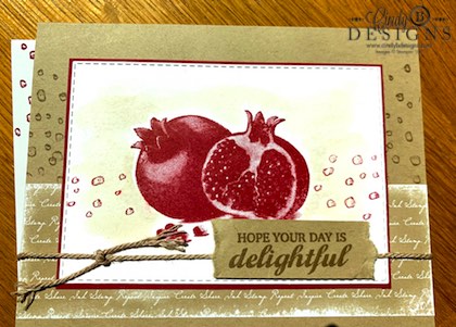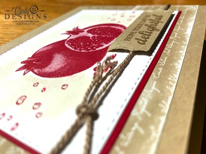 The large pomegrante image from Slice of Happiness was stamped in Cherry Cobbler onto Thick Whisper White CS. I used an AquaPainter with a little Crumb Cake ink to shadow around the image to ground it. Another forgotten technique was used on this card of the script DSP of using a sand eraser to distress. Nature’s Twine is an item I forget to use.
