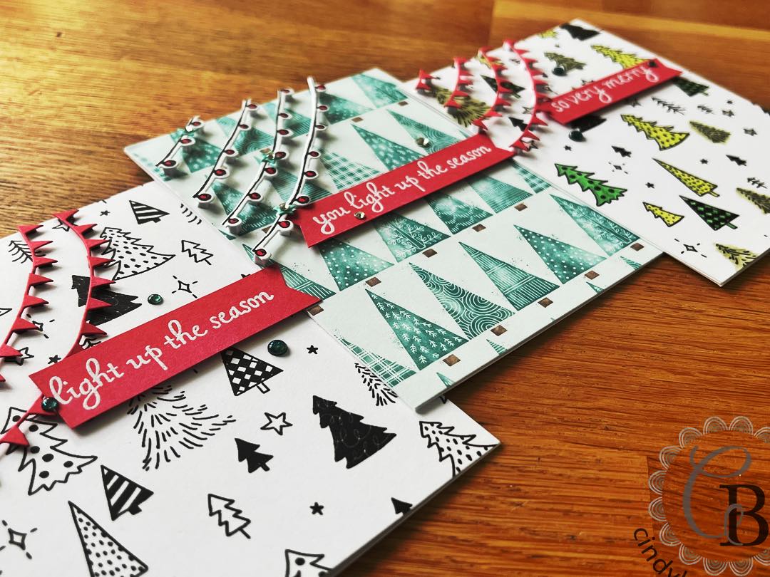 I brought in our other Holiday products of Celebrate Everything and Storybook Gnomes Designer Series Paper. This trio of cards was only time consuming because I cut Mini Stampin’ Dimensionals into quarters to adhere to the banners and bulbs for dimension.