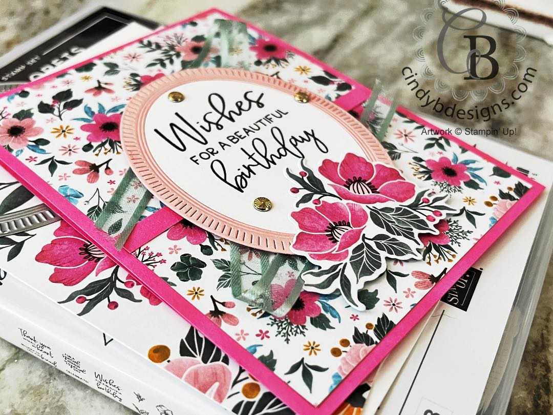 I started out with an A2 top-folding Polished Pink CS card base and layered on a piece of 4 x 5-1/4 Fitting Florets Designer Series Paper with liquid adhesive.