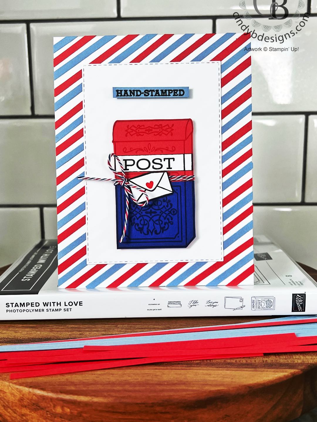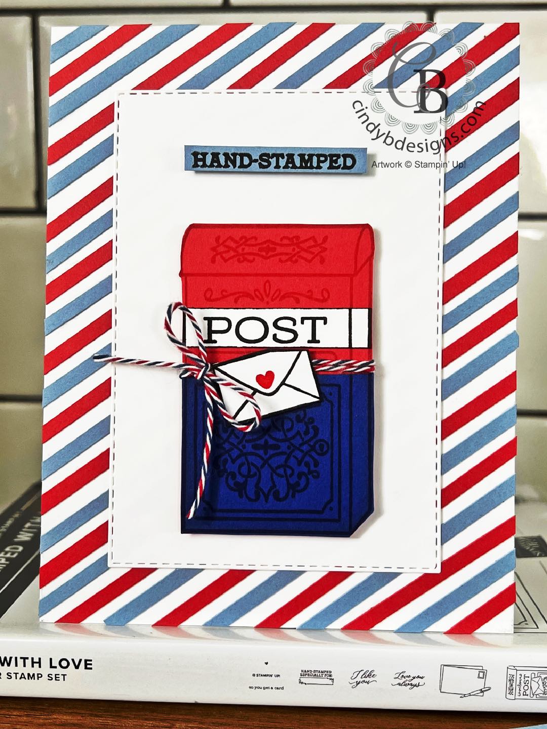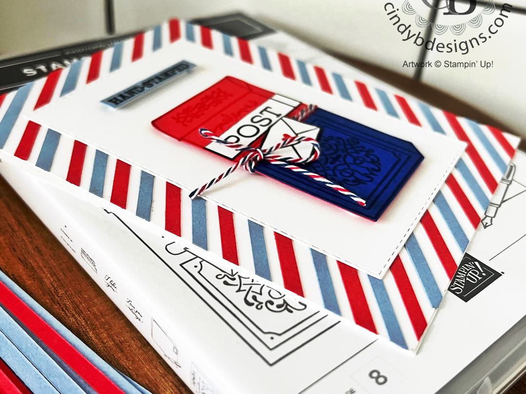 Today’s colors are Poppy Parade, Boho Blue, and Starry Sky; all of which are perfect postal colors. I used some postal twine that I’ve had in my stash for years around the post box. If you keep your Paper Pumpkin kits, this stamp set coordinates beautifully with the January 2018 Paper Pumpkin.