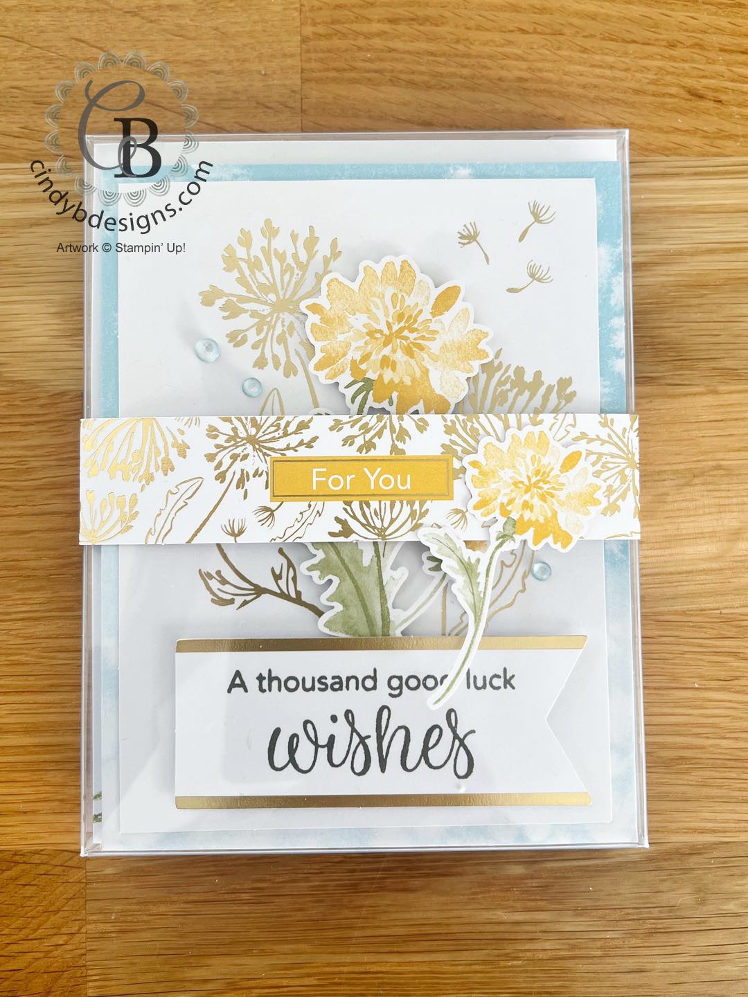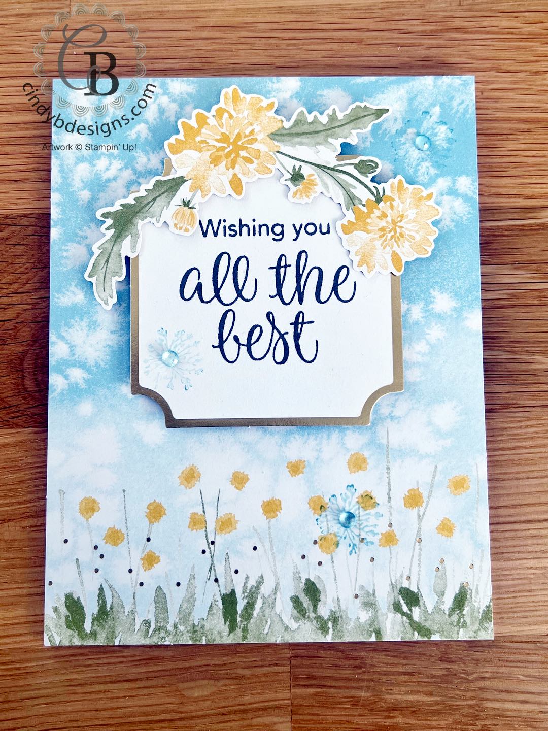 Our 2nd card has a Basic White Thick CS base that I layered another card front on from the kit. The sentiment was stamped in Pebbled Path onto a kit label and adhered with Stampin’ Dimensionals, as was the large floral image above the sentiment. I inked up one of the small flowers from All The Best stamp set in Balmy Blue that was stamped off several times onto the card front with a Balmy Blue gem from the kit adhered to the center of the flowers.