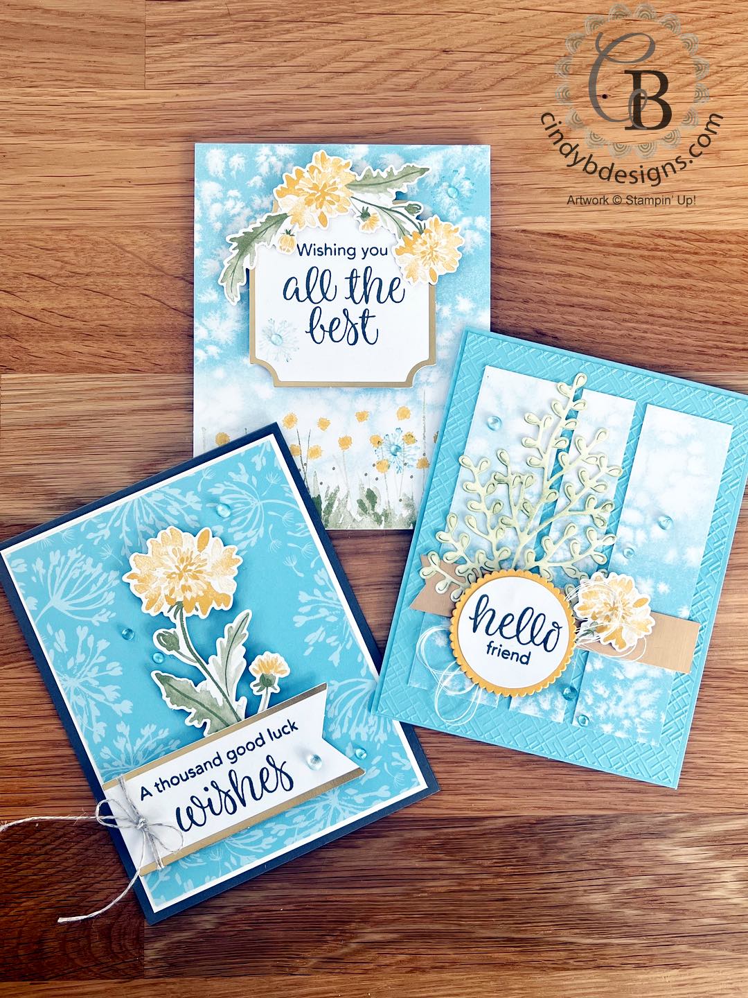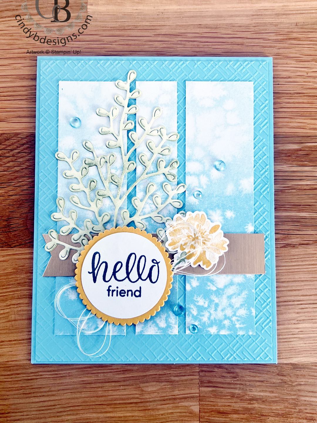 For the last card, we have a Balmy Blue card base that I layered on an Basic EF panel onto with liquid adhesive. I cut down another card front from the kit into panels and adhered these to the card front with liquid adhesive. I cut a large leafy image from Gorgeously Made Dies out of Basic White Regular CS and used a Blending Brush with Old Olive ink to give it a little color that was adhered with liquid adhesive. I cut a gold Brushed Metallic CS and bannered the left side that was then adhered to the card base with Tear & Tape. I cut a Crushed Curry CS scallop from Layering Circles and another from Basic White Regular CS that the sentiment was stamped 0nto with Pebbled Path ink and was adhered atop of the scallop circle. I created a white thread nest under the sentiment circle and adhered this to the card with Stampin’ Dimensionals. I tucked one of the small kit flower stem under the sentiment circle with a Stampin’ Dimensional at the top. Again, more Balmy Blue gems were used to further embellish.