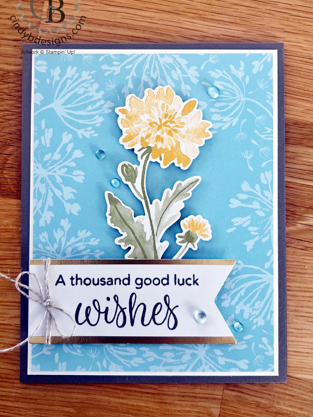 This card has a Pebbled Path card base, a Basic White Regular CS mat with the image panel cut from one of the card fronts in the kit. The sentiment was stamped in Pebbled Path and I tied Linen Thread around the sentiment panel that was adhered to the card base with Stampin’ Dimensionals, as was the large flower from the kit. Balmy Blue gems were used to embellish.