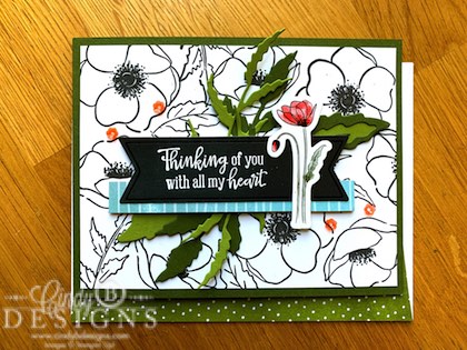 You will find this beauty on page 24 of the new Spring Occasions 2020 Catalog that really utilizes the products in the Peaceful Poppies Suite. There’s stamping, die-cuts, DSP, heat embossing, coordinating elements and accessories, all put together for an easy project. The Pool Party DSP in the suite is a fantastic blast of unexpected color that literally brings this card to life.