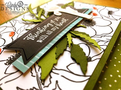 The sentiment banner is on Stampin’ Dimensionals. The black line art flowers and leaves in the background give an abstract feel to the card adding more dimension, making this an easy mail. Light Poppy Parade, Old Olive, Mossy Meadow, Pool Party, and Basic Black are the colors used today.