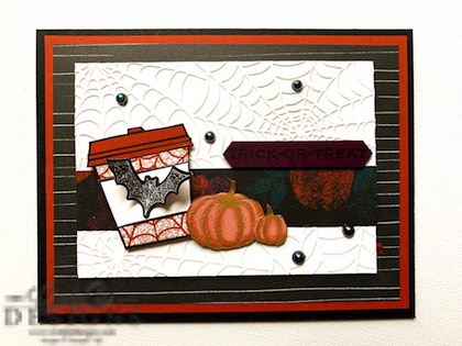 It’s amazing what you can do with our designer series paper. Using our embossing folders on Whisper White cardstock will really help reduce the starkness of the white space and adds dimension. The Cobweb embossed image panel was adhered with Stampin’ Dimensionals, as were the coffee cups, pumpkins, and sentiment panel. There was a fair amount of fussy cutting, but it was worth it in the long run. Scattered about Iridescent Pearls finish this project.