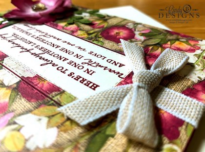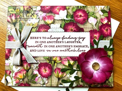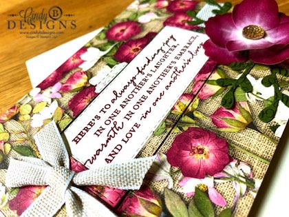Pressed Petals Specialty DSP is stunningly beautiful and true to life art. I added Linen Ribbon, stacked and inlayed Stitched Rectangle sentiment frame, a stunning Washi Tape dimensional flower with a center Gold Faceted Gem, Handwritten background stamped in Mossy Meadow punched out with the Sprig punch with a heat embossed sentiment. There is so much you can do with this amazing and fully complete product suite!