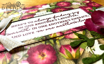 You can see the stacked + inlay die-cut dimensional sentiment frame I made. I brought in a piece of Very Vanilla CS, rubbed the Embossing Buddy over it, stamped sentiment with Merry Merlot ink, covered with clear embossing powder, shook off excess, then heat embossed. This gives a beautifully raised and elegant element to the card upping a formal factor. I die-cut it out with a Stitched Rectangle die. I then placed the same die onto a piece of Pressed Petals Specialty DSP first, then Merry Merlot CS x2; used the next size up die to place over, centering the die-cut proportionally, taping them together, then die-cutting. The base of the card was completely intact. The DSP was cut to A2 and adhered to the front of the card covering the base in its entirety. After the frames were die-cut. I inlaid one of the Merry Merlot frames inside the DSP and adhered the Very Vanilla sentiment panel so it would line up when I stacked and adhered the frames.