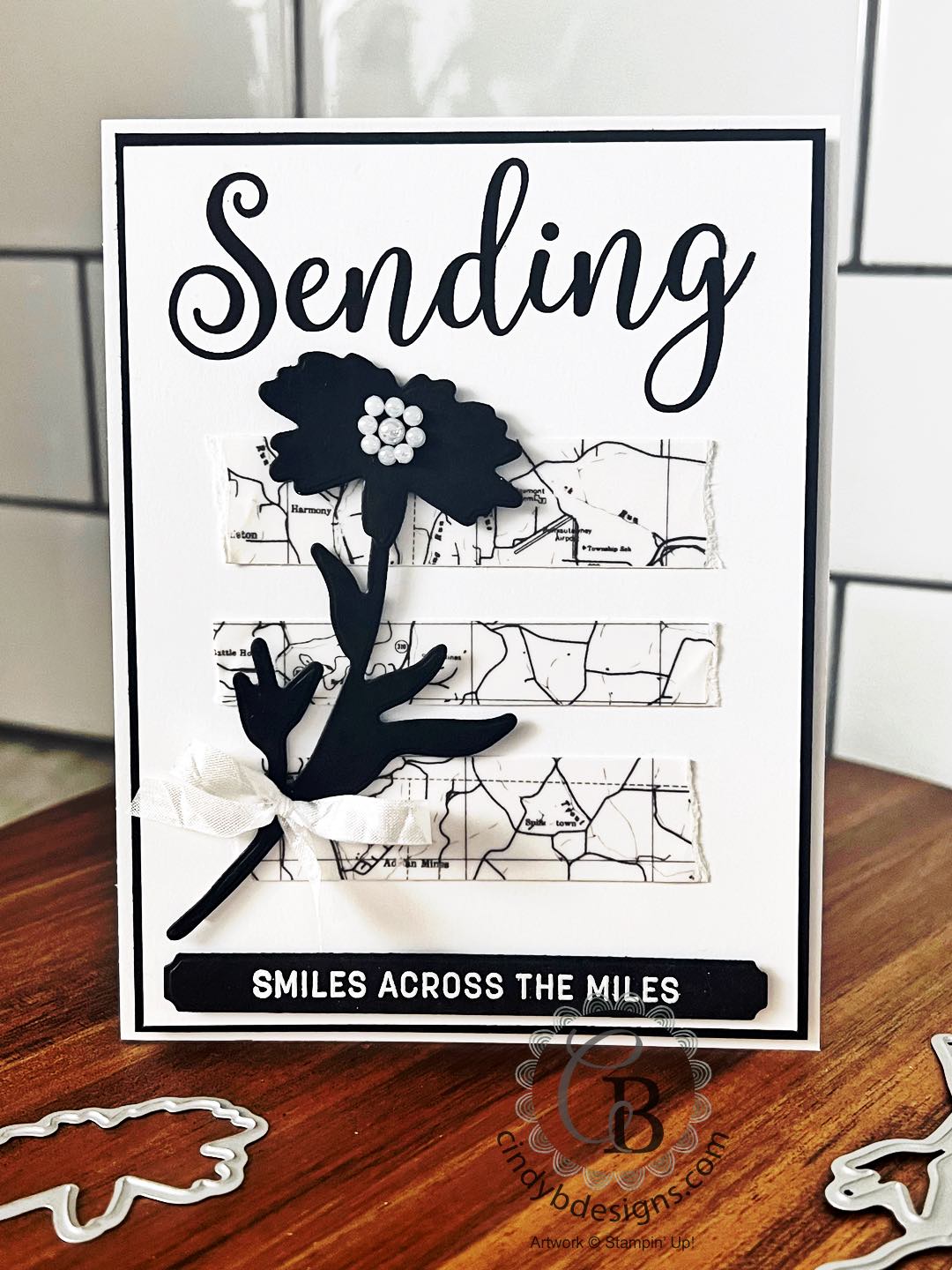 The lower sentiment was stamped onto Basic Black CS with Versamark, heat set with our white powder, then cut from its coordinating Sending Die from the Sending Smiles Bundle.