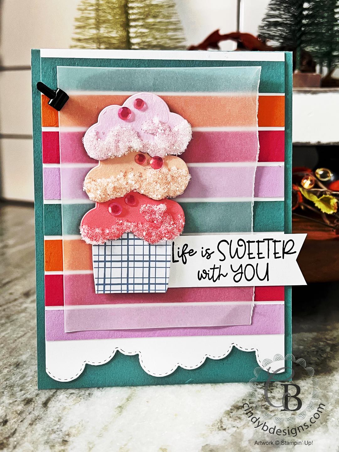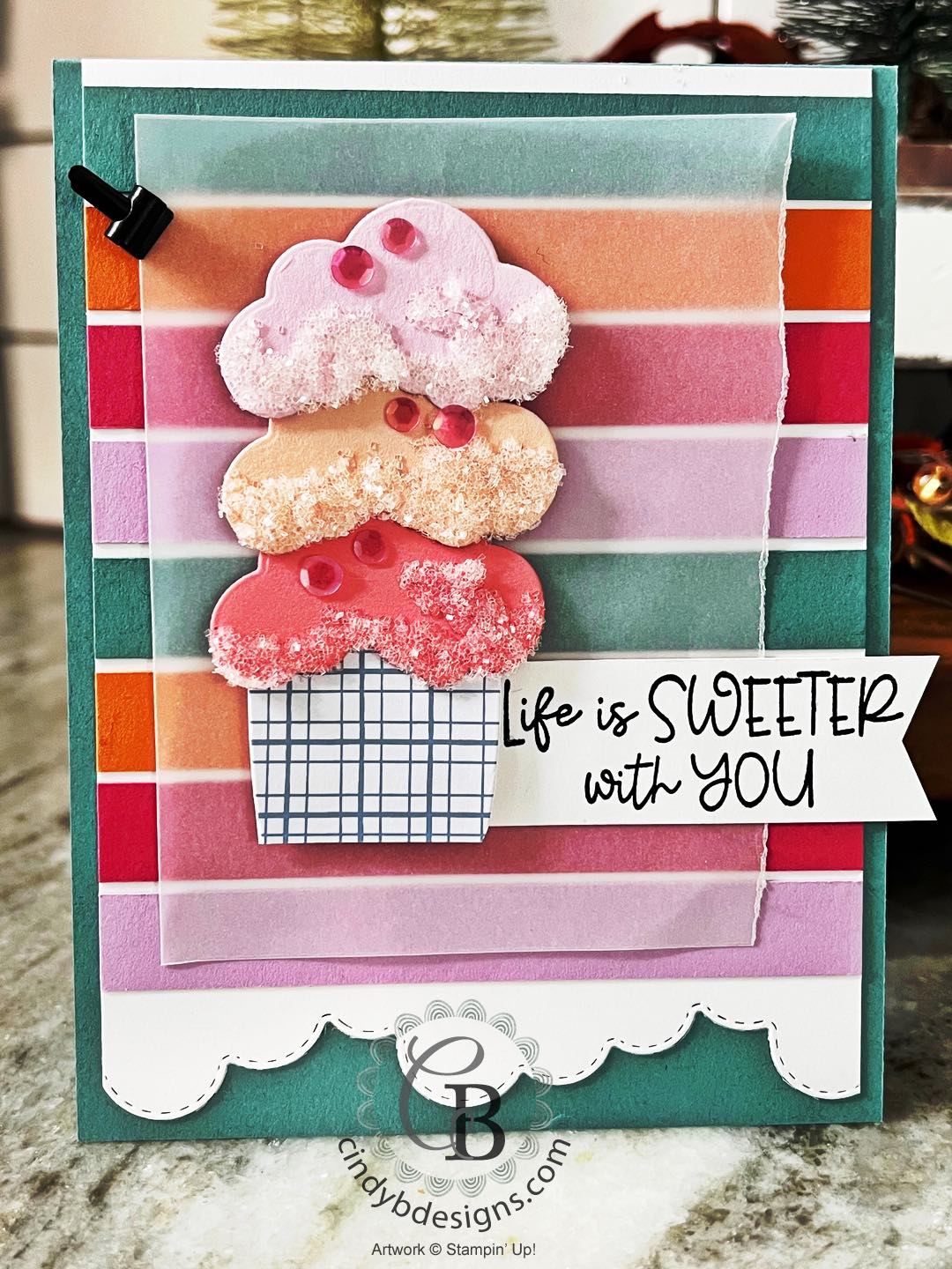 For final assembly, I adhered the all of the ice cream images with Stampin’ Dimensionals onto the Vellum CS. I adhered the Vellum panel to the card with liquid adhesive behind the ice cream images.