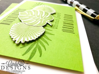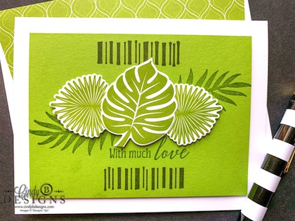 I’m obviously still on a monochrome kick a bit and thought that I’d share this fun card with you today stamped and die-cut with the Tropical Chic and Tropical Dies. The sentiment, die-cut and stamped palms are in Granny Apple Green, as is the image mat. The barcode image was stamped in Old Olive.
