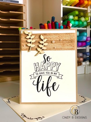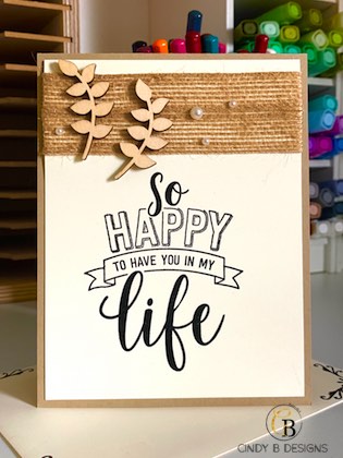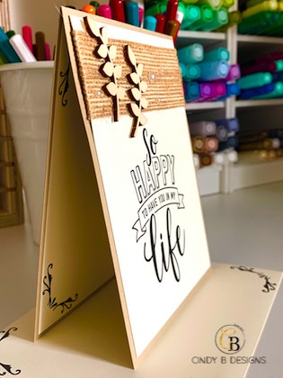 We have a Crumb Cake A2 top-folding card with a 4 x 5-1/4 Thick Very Vanilla panel that was stamped with a sentiment from Amazing Life using Soft Suede, 5/8″ Burlap Ribbon wrapped twice around the top, 2 wood elements, and 4 pearls.