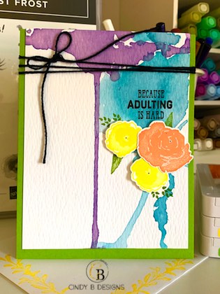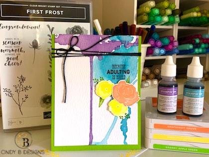 I love this sentiment from More Than Words and wanted to mix it up with almost an attitude of confusion (dripping watercolor) to the calmness of flowers. That was actually Plan B after the unplanned watercolor drips. I used Balmy Blue and Highland Heather reinkers on watercolor paper with an AquaPainter.