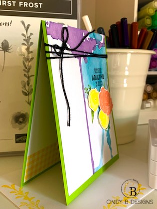 The Granny Apple Green foliage is from Incredible Like you, which is also a DistINKtive stamp set like First Frost. I interchange all DistINKtive stamp sets to get my desired effect. The flowers were stamped in Grapefruit Grove and Pineapple Punch, and cut out with their coordinating framelits. In the center of the flowers, I added a small dot with a Basic Black Stampin’ Write Marker. They are adhered with Stampin’ Dimensionals. The black dot, sentiment, and baker’s twine are all Basic Black.