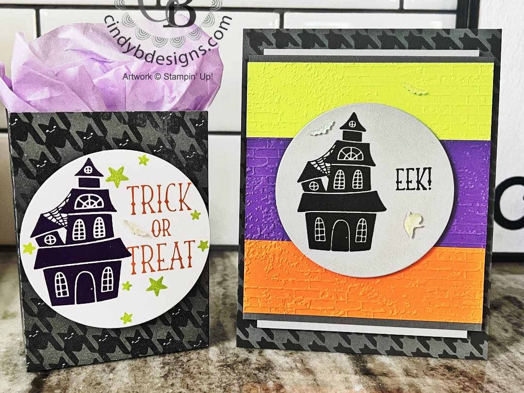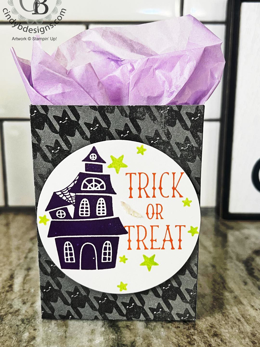 This bag was cut from the Tricks & Treats Dies and assembles easily. You will have to cut 2 and watch your pattern. I stamped the haunted house in Gorgeous Grape, the sentiment in Pumpkin Pie, and the stars in Parakeet Party. This was also cut using the largest circle from Layering Circles Dies and adhered to the bag with Stampin’ Dimensionals.