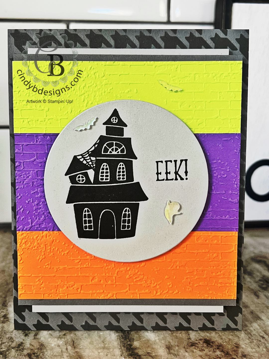 I stamped the haunted house image and sentiment from Tricks & Treats onto Smoky Slate CS with Memento Tuxedo Black ink and cut from the largest Layering Circles Die. This panel was adhered to the card with Stampin’ Dimensionals. Two bats and 1 ghost Glow-in-The-Dark Bats & Ghosts were used to embellish.