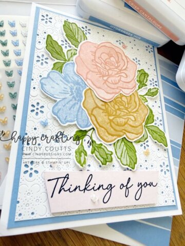I started out with a Basic White Thick CS base and layered on a piece of Hydrangea Hue CS. Next, I embossed a piece of Basic White Regular CS using the new April 2026 Product of the Month of Eyelet Blooms Die, all of which were adhered to the card base with liquid adhesive.