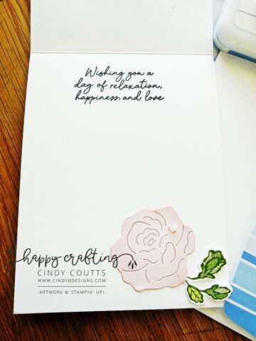 For the inside, a standalone flower was cut from Barely Blush CS with a spring of leaves to embellish + a butterfly, with the sentiment stamped in Basic Black Hybrid Ink.