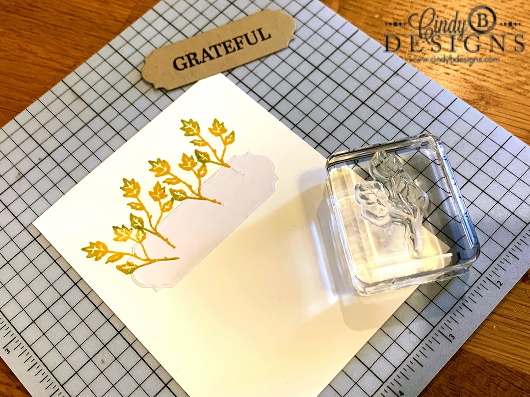 I cut a piece of Basic White Regular CS to 3-3/4 x 4-3/4. My Bumblebee leaf accent stamp lightly inked up with Old Olive ink around the edges was planned around my sentiment mat and panel. I used my Ornate Frame die to cut a piece of masking paper that I adhered to the image panel where I wanted the focus point. I inked up the leaf image with Bumblebee and Old Olive using Clear Block B to impress the image around the mask, as shown below.