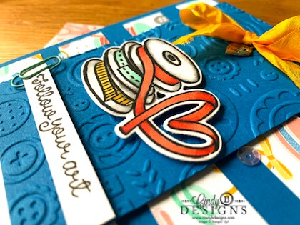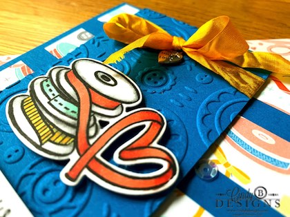 I laid out the ribbon spool image onto Thick Whisper White with Memento on the Stamparatus and left the image inside on the door while I colored the spools with Stampin’ Blends in Calypso Coral, Mango Melody, Pool Party, and Smoky Slate. Mango Melody and Pool Party are not colors in the suite, per se, but they were close enough for a near perfect to Crushed Curry and Coastal Cabana. I used the Color Lifter Marker to pull out and muddy up the Smoky Slate, placed the CS with colored image back into the Stamparatus, re-inked and re-stamped, then die-cut the image out. I do this because I like crisp impressions and sometimes adding color to an image will compromise your line art. I tied a piece of Crushed Curry Crinkled Seam Binding (I love this stuff) around the top of the dry embossed panel and adhered a heart charm from the Follow Your Art Embellishment Kit. The Coastal Cabana paper clip is also from the kit. A trio of clear sequins from the Gingham Gala mix helps add balance to the right of the card.