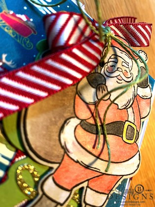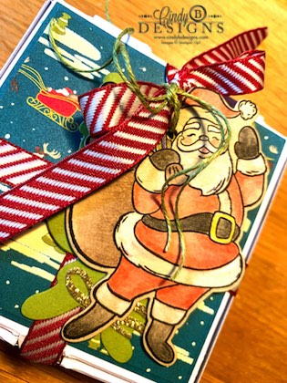 I used watercolor pencils to fill in Santa Claus. I blended out all of the colors but the white on the fur parts of Santa’s clothes. Adding our new Snowfall Accents Puff Paint would have been a fun touch. I die-cut the Santa from Old Olive CS to use as a To/From tag, die-cut the word Tis The Season from Gold Glimmer Paper, and the colored in Santa die-cut from Crumb Cake. Old Olive Linen Thread leftover from a Paper Pumpkin Kit was used to tie the tag to the Cherry Cobbler Diagonal Stripe Ribbon, which is an absolute dream to work with.